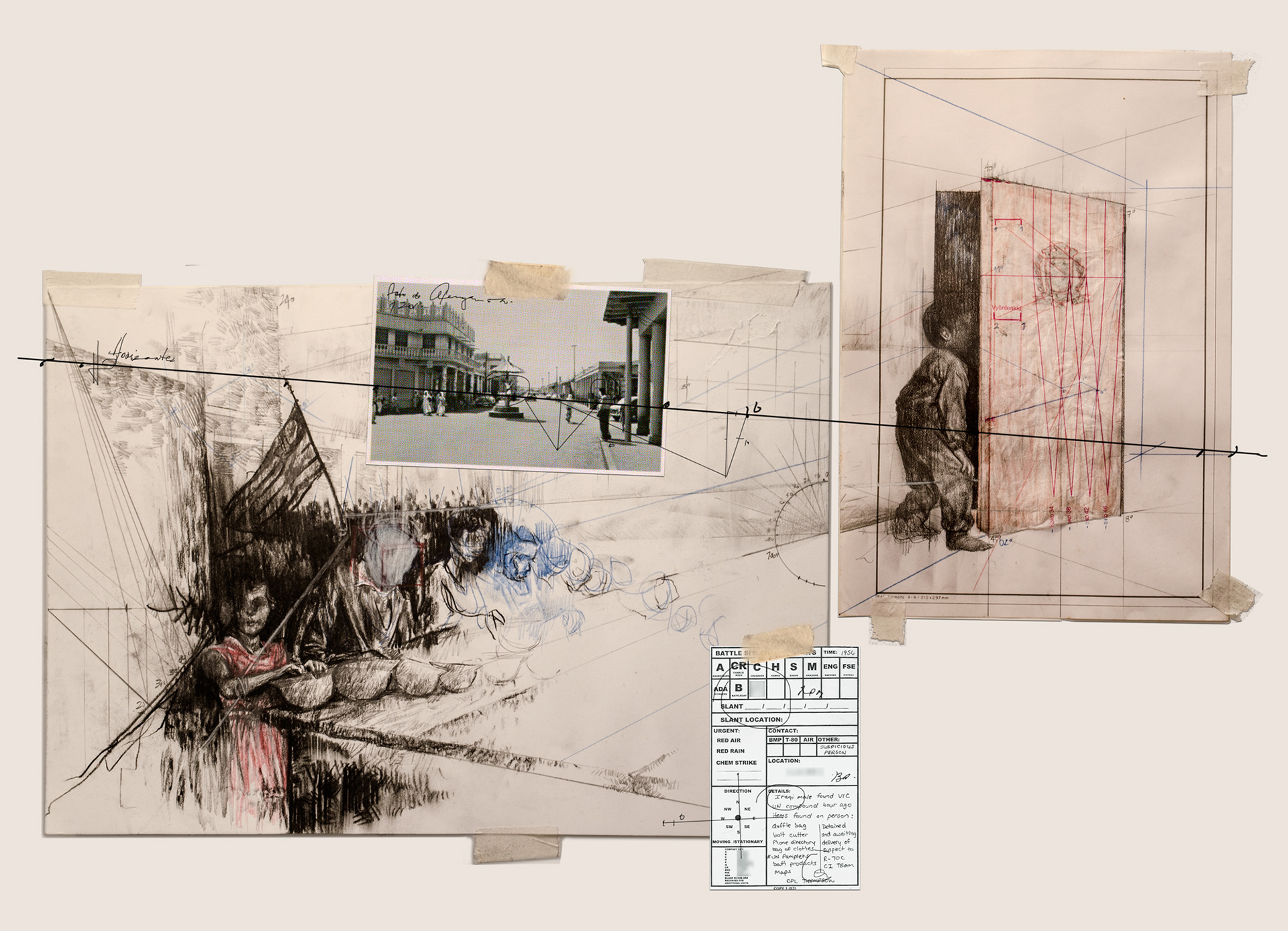 graphite, gouache, conté, nankim and collage on paper and old proper documents - 65 x 95 cm